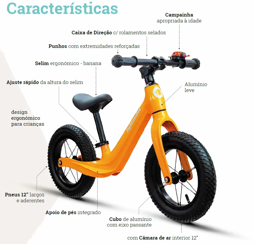 Usamos materiais e componentes de qualidade nas nossas bicicletas. Veja algumas das especificações mais relevantes da Bicicleta de equilíbrio Sor em baixo
